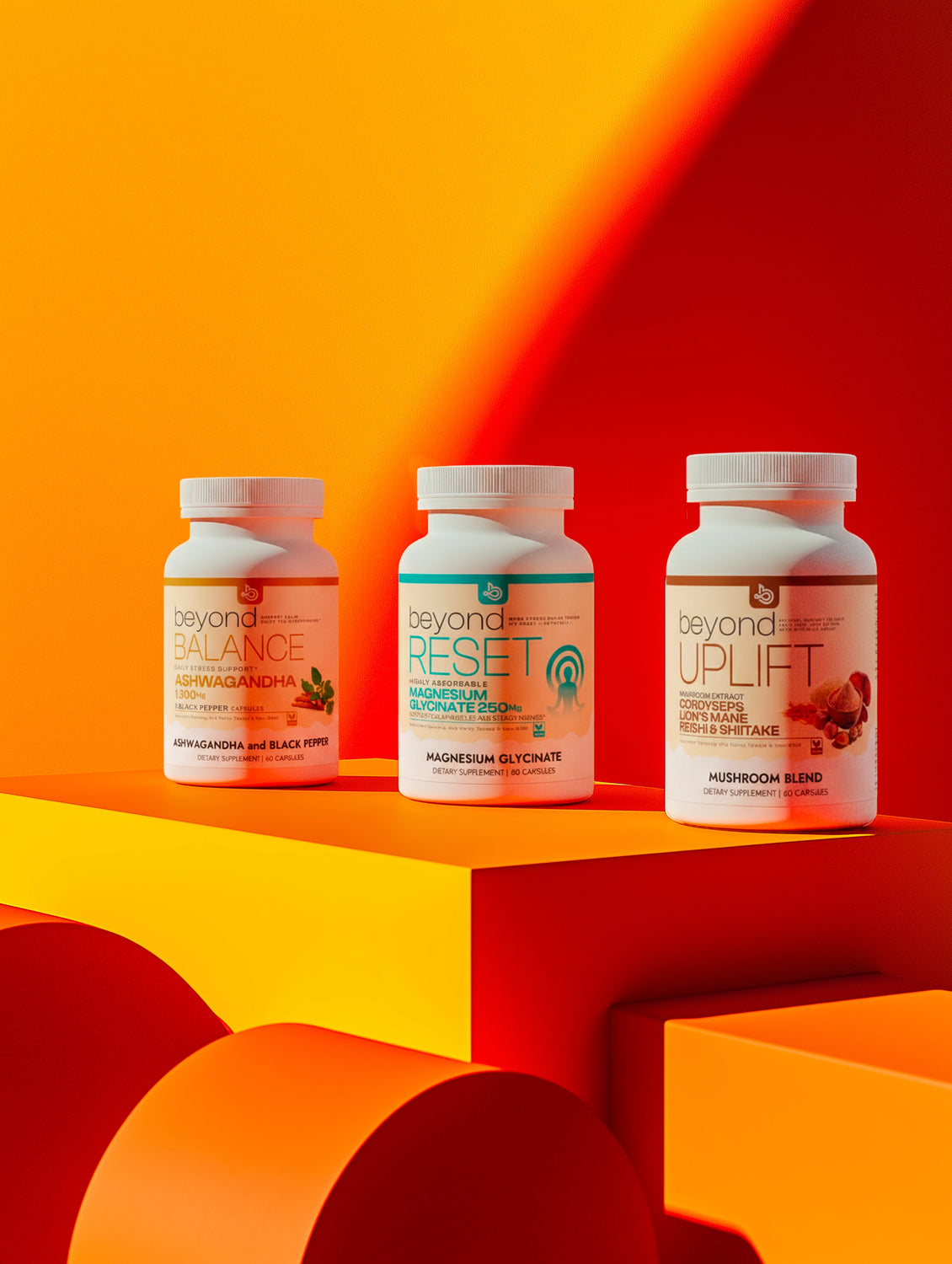 Our formulas support calm through three key pathways: Adaptogens in Beyond BALANCE for stress response, essential Minerals in Beyond RESET for physical tension, and a Mushroom Complex in Beyond UPLIFT for active resilience.